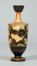 | Mi ez? | Athéni feketealakos lékythos | | Mikor készült? | 480–470 | | Ki készítette? | Diosphos-festő | | Hol található? | Szépművészeti Múzeum, Antik Gyűjtemény | | Méret: | magasság: 20 cm | | Állapot: | A fül hiányzik. A bal szélső alak előtt az edénytesten, a vállon és a nyak tövében kiegészítés. | | Leltári szám: | 77.19.A |