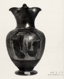 Az athéni műhelyben készült oinochoé széles, lapos talpon ülő, lapított, lefelé szűkülő tojásdad testéhez lóherekiöntős nyak, hátul, a perem és a váll között pedig egy vastag függőleges irányítású rúdfül illeszkedik. A váza egyedüli díszített része elől a testet, a nyak hajlat és a test alsó harmada között elfoglaló képmező, amelyet felül függőleges vonalsor, két oldalt pedig függőleges vonalakból és pontsorokból álló motívum keretez. A kép két táncoló mainast ábrázol körülöttük kígyózó indákkal. A két nőalak egymástól elfordulva, de egymásra visszanézve, lábaikat felemelve táncol, a jobb oldali kezében krotalával. Mindkét mainas hosszú ruhában, nyaklánccal, fejükön szalaggal van ábrázolva. A fekete alapszín mellett járulékos fehér jelöli a női testnek a ruha alól kilátszó részeit, a nyakláncokat és a ruhák hármas pont díszeit. Vörös színűek a hajszalagok, a fejen lévő szalagdíszek és a térkitöltő borostyánágak.