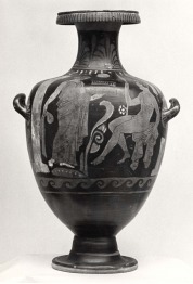 A harang alakú talpon álló, ovoid testű hydria vörös alakú díszítése sírjelenetet ábrázol. A lehajló peremen függőleges vonalkázás fut körbe. A nyakat álló palmettasor díszíti. A hydria két füle között helyezkedik el a fő képmező. Az oldalsó, vízszintes felhelyezésű füleket spirális-palmetta inda motívum veszi körbe. A függőleges fül alatt indákkal keretezett nagyméretű álló palmetta látható. A díszítő zóna alatt a váza testének alsó harmadán futókutya motívum fut körbe. A központi képmező bal szélén fehér rátett festéssel jelzett sírsztélé előtt egy fején sakkost viselő, chitónos, köpenyes nőalak áll, bal kezében dobozt, jobbjában szalagot tartva. Tekintetével a kép jobb szélén, köpenyén ülő, jobbjában lándzsát tartó meztelen ifjúra néz. Kettőjük között térkitöltő elemként egy spirális-fa magasodik, felettük pedig napkorongként értelmezhető járulékos sárga színnel festett korong motívum. Az ifjú mögött a kép bal szélének sztélé ábrázolásához hasonló fehérrel festett oltár látható. Ez a két tárgy egyértelműen a temető szférájába helyezi a jelenetet. Az ifjú a halott megjelenéseként értelmezhető, neki szól az álló nőalak áldozata. A váza campaniai műhelyben készült a Kr.e. 4. században. |