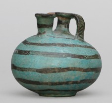 A talpgyűrűn álló edény lapított gömb alakú, a keskeny álkiöntő fedőkorongjának két oldala és a váll között egy-egy függőleges szalagfül. Az álkiöntő előtt rövid, kihajló peremű kiöntő található. A szalagfüleket rövid rézsútos vonalkázás díszíti. A mykénéi kengyeles (álkiöntős) korsó kékeszöld színű, fekete sávos fajansz utánzata, amely a mai Szíria, Libanon területén (azaz a levantei partvidéken) vagy Egyiptomban készülhetett. |