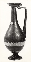 Sötétkék színű, közepes falvastagságú kancsó. Tölcséres, a szélén behajló szája alján gyűrű van, a hosszú, hengeres nyak körte alakú testté szélesedik ki, alján visszahajló talp található. Az ugyancsak kék, kerek metszetű fül a testtől a szájperem aljáig ér. A kancsó díszítése három sor világoskék, opalizáló, összefolyt üvegfoltból áll: a fölső, kis foltokból álló sor a nyak alját veszi körül, a jóval nagyobb foltokból álló középső sor az edénytest legnagyobb átmérőjén fut körbe, a harmadik, jóval kisebb foltokból álló sor az edény aljához közel fekszik. A nagyjából kerek foltok mellett a testet néhány csoportban alig észrevehető, vékonyan bekarcolt vízszintes vonalak díszítik. A középső foltsor fölött mintegy 2,5 cm-re, kissé az edény felületébe mélyítve arany betűk nyomai vehetők ki - ma már csak nagyító segítségével, a felirat szövege: ACCIPE VIVAS IN DEO. Hasonló, bár nem azonos felirat számos ókeresztény tárgyon megjelenik. |