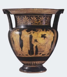 A lépcsős talpon álló, öblös testű athéni vörösalakos oszlopkratér egy caerei etruszk sírból került elő. A kratért legtöbb kiegészítő díszítése, a fő képmezőket keretező motívumok: felül nyelvminta, két oldalt borostyáninda sor, alul pedig vízszintes sáv; valamint a lehajló szélű szájperem oldalán körbefutó vízszintes vonallal keretezett borostyánág fekete festésű. Az A oldal képmezője felett, a nyakat díszítő, körívbe zárt öt álló palmetta vörösalakos kivitelű.