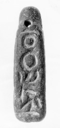 Barnásvörös márgás agyagból kézzel mintázott hasáb alakú amulett, amelyet felfüggesztés céljából a felső részén kifúrtak. Egyik oldalán bekarcolt pálmaágak láthatók, a másik három oldalára feliratot véstek. Az amulett két oldalán folytatólagosan olvasható görög szöveg: "egy az isten, a segítő" számos kopt imádság bevezetéséül szolgált, gyakorta írták fel sírkövekre, amulettekre és liturgiai tárgyakra. A harmadik oldal olvasata bizonytalan.