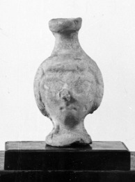 Világosbarna agyagból két formában megmintázott női fej alakú edény. Az arc szinte szabályosan kerek, negroid vonásokat mutat, de részletei az erősen kiugró orrtól eltekintve elmosódottak. Az arcot keretező hajat sematikus, kettős félkörökből álló fürtök alkotják, a nyak kerek talapzathoz kapcsolódik. A fej tetején vastag peremben végződő kiöntő található, amelyhez a fej hátsó részéről induló szalagfül csatlakozott. Teljesen elkopott formából, rendkívül durván mintázták, az edény hátul domború, kidolgozatlan. Az arcon és a nyakon vörös színnyomok láthatók. Feltehetően Abu Ménában készült, ahol tömegesen gyártották az effajta fejedényeket, és minden bizonnyal a szent sírjánál elhelyezett mécsesek olajával, vagy csodatévő vízzel töltötték meg őket. A női fejet formázó miniatűr edénynek görög, etruszk és római előképei is ismertek. Pergamonban a Kr. u. 3. század végén - 4. század elején élesztették újjá ezt a hagyományt, ami minden bizonnyal hatással volt Abu Ména kerámiakészítésére is. A pergamoni fejedények késő-hellénisztikus elődeikhez hasonlóan Dionysos kultuszával álltak összefüggésben. Az Abu Ména-i zarándokok jelentős része feltehetően gyermekáldásért fohászkodó asszony volt. |