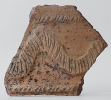 Domborműves zsinórdíszítéssel ellátott, nagyméretű tárolóedény, pithos töredéke, a knóssosi palota területéről. Ilyen edények sorakoztak a paloták hatalmas raktáraiban. Bort, olajat, gabonát egyaránt tárolhattak bennük. |