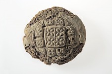 Kerek és domború, lyukacsos állagú kis kenyér, fele részében formából készített reliefdíszítéssel. Az előoldal közepén körbe foglalt mezőben négyszögletes keretbe zárt rozetta-csoportokat rendeztek el. A kör külső része körül felirat fut végig (?).