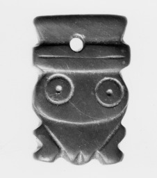 Ez a függő talán stilizált nőalakot formáz: a két mellet egy-egy bekarcolt, középen ponttal ellátott kör jelzi, a lábakat és a nemszervet kifaragták. A fej közepén látható lyuk a tárgy felfüggesztésére szolgált. Ez a faragvány azoknak a terrakotta nőalakoknak kőből mintázott változata, amelyek közül az Antik Gyűjtemény is több darabot őriz, de talán még szorosabb rokonságot mutat a csontfaragványokkal, amelyek a 8. század táján váltották fel a terrakotta figurákat. A szobrocskákat feltehetően a házassággal, termékenységgel és gyerekszüléssel kapcsolatban hívták segítségül.