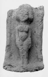 Durva, élénkvörös színű nílusi agyagból készült dombormű, amely fülkében álló, ruhátlan nőalakot ábrázol. A nőalak egyiptomi jellegű parókát visel, két karját a combjához szorítja, mandulavágású szemét bekarcolással jelezték. A plakett hátlapja sima, a fülke ábrázolásából a két oszlop látható. A szembenézetből ábrázolt, ruhátlan nőalakok, amelyeket gyakran valamely hangszerrel a kezükben ábrázoltak, Hathorral, az öröm, a tánc, a zene és a szerelem egyiptomi istennőjével hozhatók kapcsolatba. A domborműves plakettek nem magát az istennőt, hanem papnőit ábrázolták, akikkel az áldozati tárgy elhelyezője talán azonosította magát. Hathor ugyanakkor halotti istenség is volt, aki a túlvilágon fogadta és táplálta az elhunytakat: elképzelhető, hogy ezeket a domborműveket is sírmellékletnek szánták, és funkciójuk a közép- és újbirodalmi ágyasszobrok szerepét folytatta. |