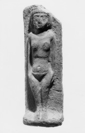 Közepesen durva, élénkvörös nílusi agyagból, egy formában készült, tömör dombormű. Talapzaton álló, ruhátlan nőalakot ábrázol, szigorúan frontális nézetben, oldalához szorított karral. A nő egyiptomi jellegű, háromosztatú parókát visel, keble és a medencetájék külön hangsúlyt kapott. A szembenézetből ábrázolt, ruhátlan nőalakok, amelyeket gyakran valamely hangszerrel a kezükben ábrázoltak, Hathorral, az öröm, a tánc, a zene és a szerelem egyiptomi istennőjével hozhatók kapcsolatba. A domborműves plakettek nem magát az istennőt, hanem papnőit ábrázolták, akikkel az áldozati tárgy elhelyezője talán azonosította magát. Hathor ugyanakkor halotti istenség is volt, aki a túlvilágon fogadta és táplálta az elhunytakat: elképzelhető, hogy ezeket a domborműveket is sírmellékletnek szánták, és funkciójuk a közép- és újbirodalmi ágyasszobrok szerepét folytatta.