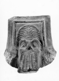 Közepesen finom, téglavörös nílusi agyagból formában mintázott zsarátnoktartó fül. A négyszögletes keretben szatírmaszk látható, sugárszerűen felfelé álló hajjal és hosszú, egyenesen előrenyúló szakállal.