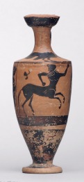 Kicsi, párnatag alakú talp, hosszúkás, lefelé keskenyedő testű lekythos, élesen megtörő vállal. A konkáv alakú nyakhoz ívesen tölcséres keskeny szájperem csatlakozik. A vállból kiinduló szalagfül a nyak középső részéig tart. A szájperem, a fül külső fele, a láb, és az edény alja fekete mázzal van bevonva. A vállon a csoport névadó díszítőmotívuma (attribúció): két borostyánlevél között kakas sziluettje. A fő díszítést az edény törzsén, egy alapvonalként is szolgáló vastag fekete sávra festették: két köpenyes, pálcát tartó nőalak között visszaforduló felsőtestű, mellső lábaival felágaskodó, bal kezével követ elhajító kentaur ritka ábrázolása látható. Az alak hátsó teste fölött (alig fölismerhetően) repülő madár. |