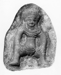 Széttett lábakkal ülő, koszorús nőalakot ábrázoló öntőminta. A darab feltehetően a Baubó típusú terrakotta kisplasztikákkal áll kapcsolatban. A nő két karjával térdére támaszkodik, ruhája alul felhúzva, mely láthatóvá teszi erősen hangsúlyozott nemiszervét. Durva kidolgozású, elnagyolt ábrázolás. A második képen az eredeti öntőmintából készült modern öntvény látható.